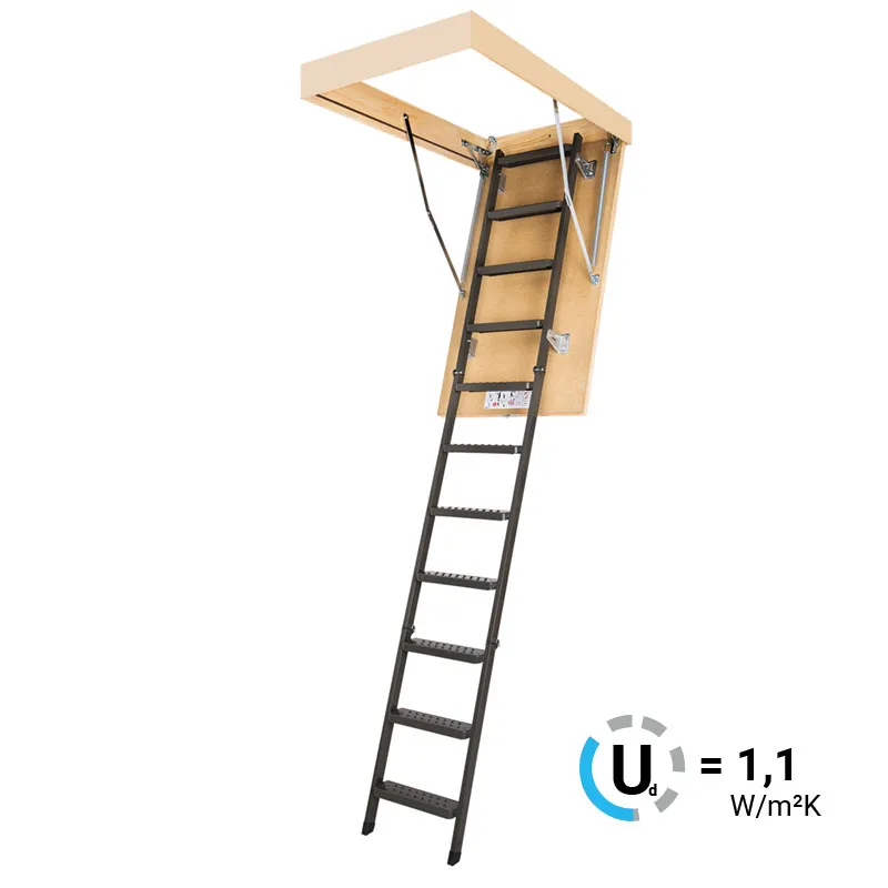 Чердачная металлическая лестница LMS – это надежная складная конструкция, состоящая из марша и термоизоляционной крышки, изготовленной из ДВП и окрашенной в бежевый цвет. Герметичность всей конструкции достигается благодаря утеплению крышки люка и контурному уплотнению по периметру, что предотвращает возможные теплопотери. Чердачную лестницу очень легко разложить и сложить благодаря наличию специального стержня с четырехугольной насадкой.