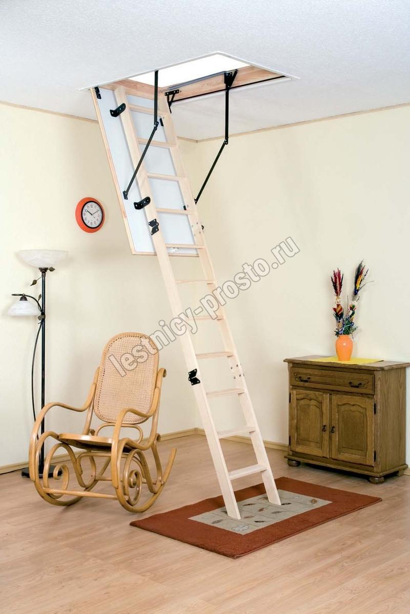 Лестница складная четырехсекционная, изготовлена из сосны. Термоизоляционная крышка типа "сэндвич" утеплена пенопластом, облицована с двух сторон ДСП белого цвета. Короб люка с уплотнителем. Все металлические элементы лестницы покрыты порошковой краской, ступени лестницы имеют антискользящие насечки и закреплены в столярное соединение «ласточкин хвост», что позволяет выдерживать нагрузку 150 кг. Деревянный стержень для открывания лестницы в комплекте.