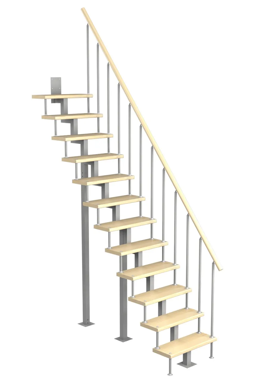 Удобная лестница на косоурах с поворотом на 90 градусов. Открытые ступени визуально облегчают конструкцию. Ограждения по всему маршу обеспечивают дополнительную безопасность и возможность декорирования. Монтаж осуществляется силами двух человек на объекте по указаниям, приведенным в паспорте на лестницу.