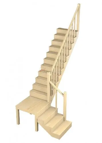 Удобная лестница на косоурах с поворотом на 90 градусов. Открытые ступени визуально облегчают конструкцию. Ограждения по всему маршу обеспечивают дополнительную безопасность и возможность декорирования. Монтаж осуществляется силами двух человек на объекте по указаниям, приведенным в паспорте на лестницу.