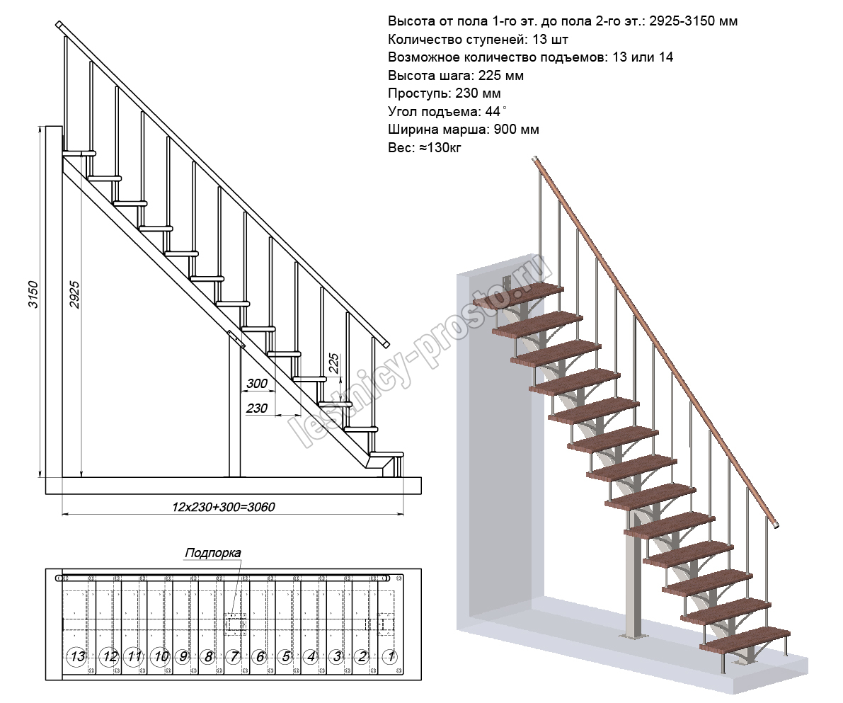 Высота лестницы 2925 - 3150 мм
