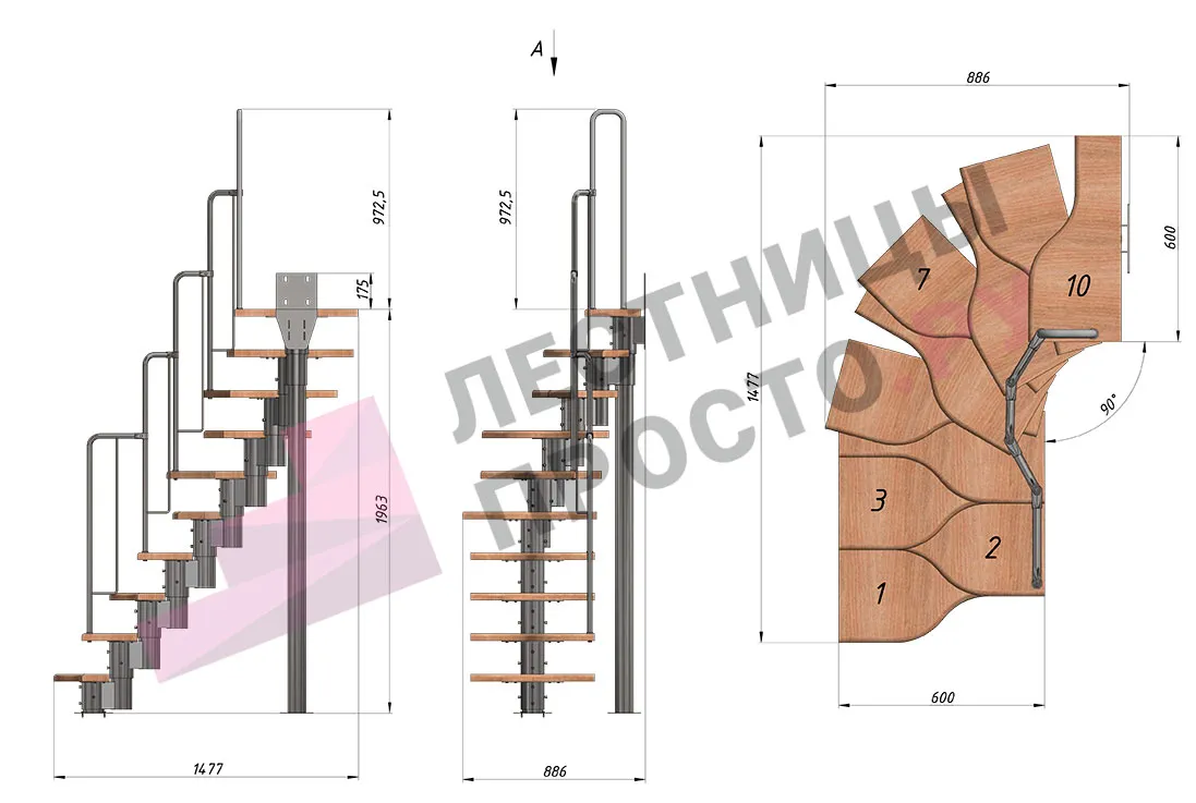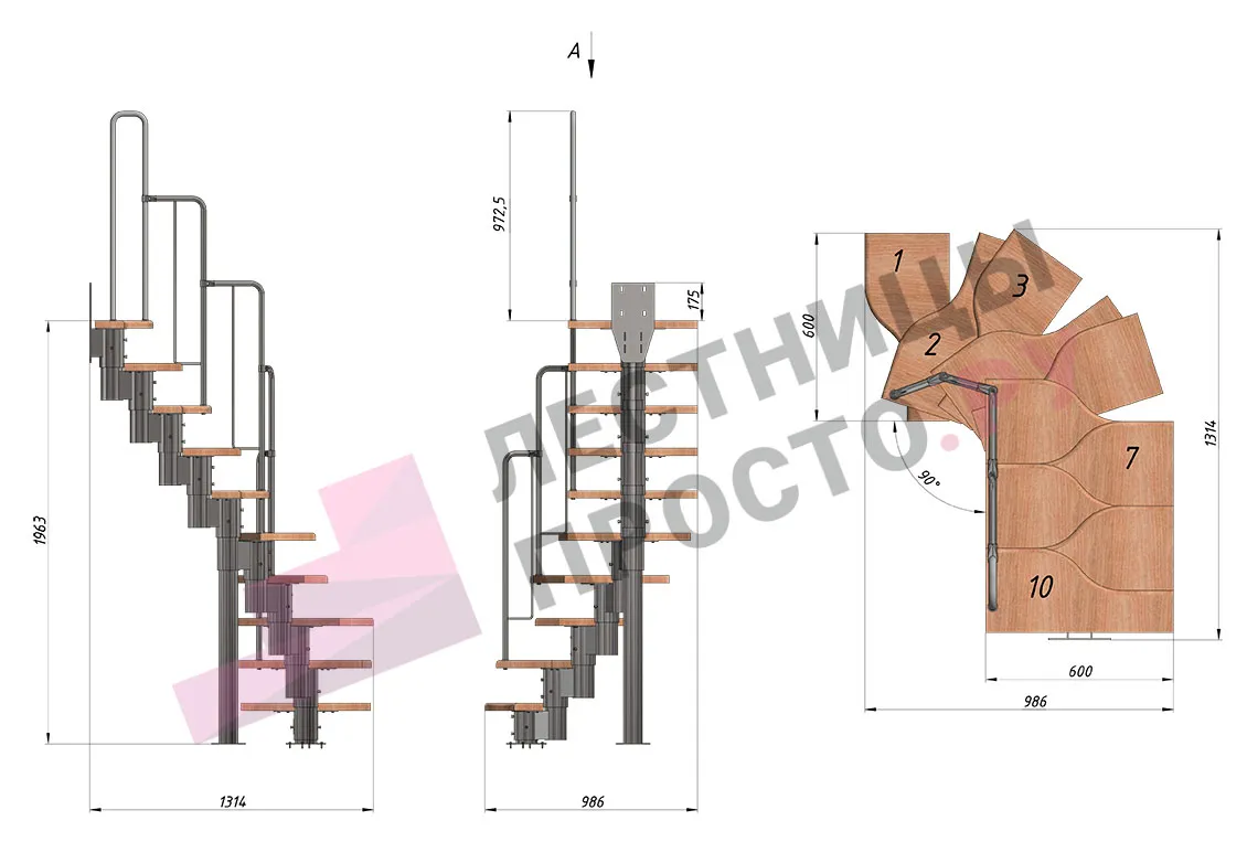 Лестница Prosto Urban Grey г-образная гусиный шаг 600 мм, h180-264 см (10 ступеней)